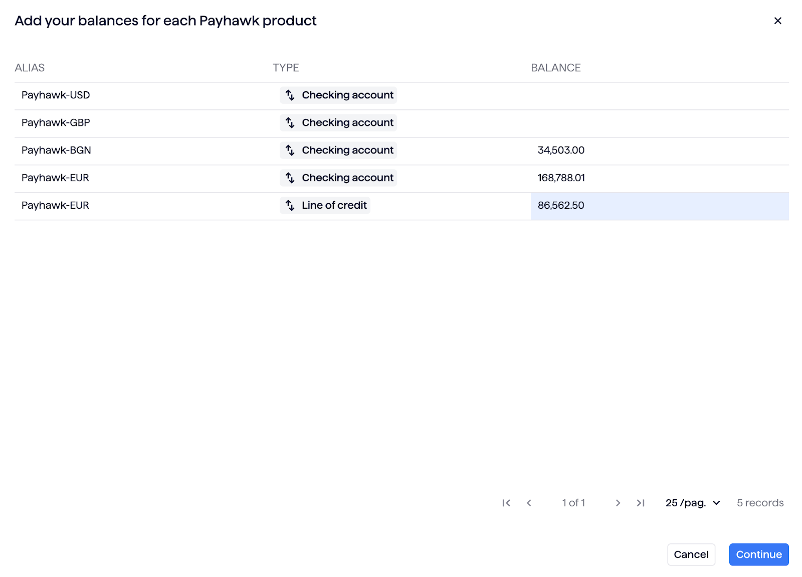 Due to a limitation in Payhawk, the initial balances of the products must be added manually. To do so, click on each row in the Balances column and enter the available balance shown for each Payhawk product.