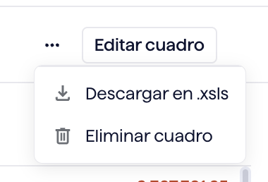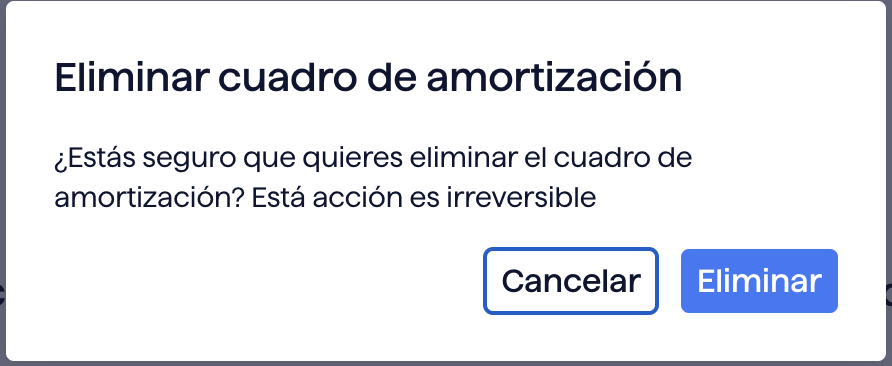 Seleccionando este apartado, y clickeando el botón eliminar, habremos eliminado el cuadro de amortización. Es importante aclarar que esta acción es irreversible y una vez clicado, deberemos cargar nuestro cuadro de amortización nuevamente para tenerlo.