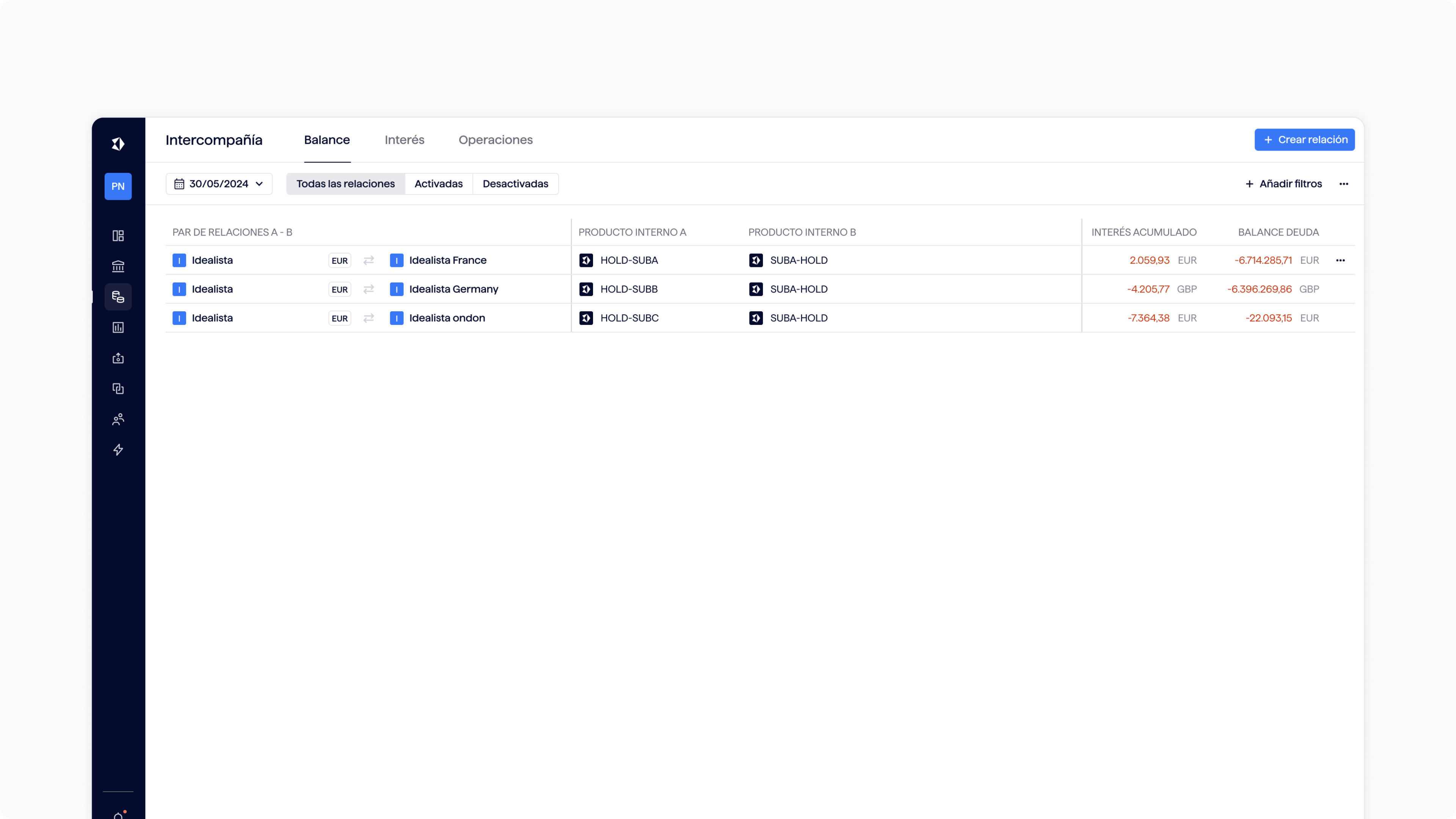 - Si la transacción pertenece a una empresa con relaciones intercompany configuradas, se mostrará la etiqueta Intercompany junto a Operaciones. Usa el filtro de compañía para seleccionar las facturas de la entidad adecuada.