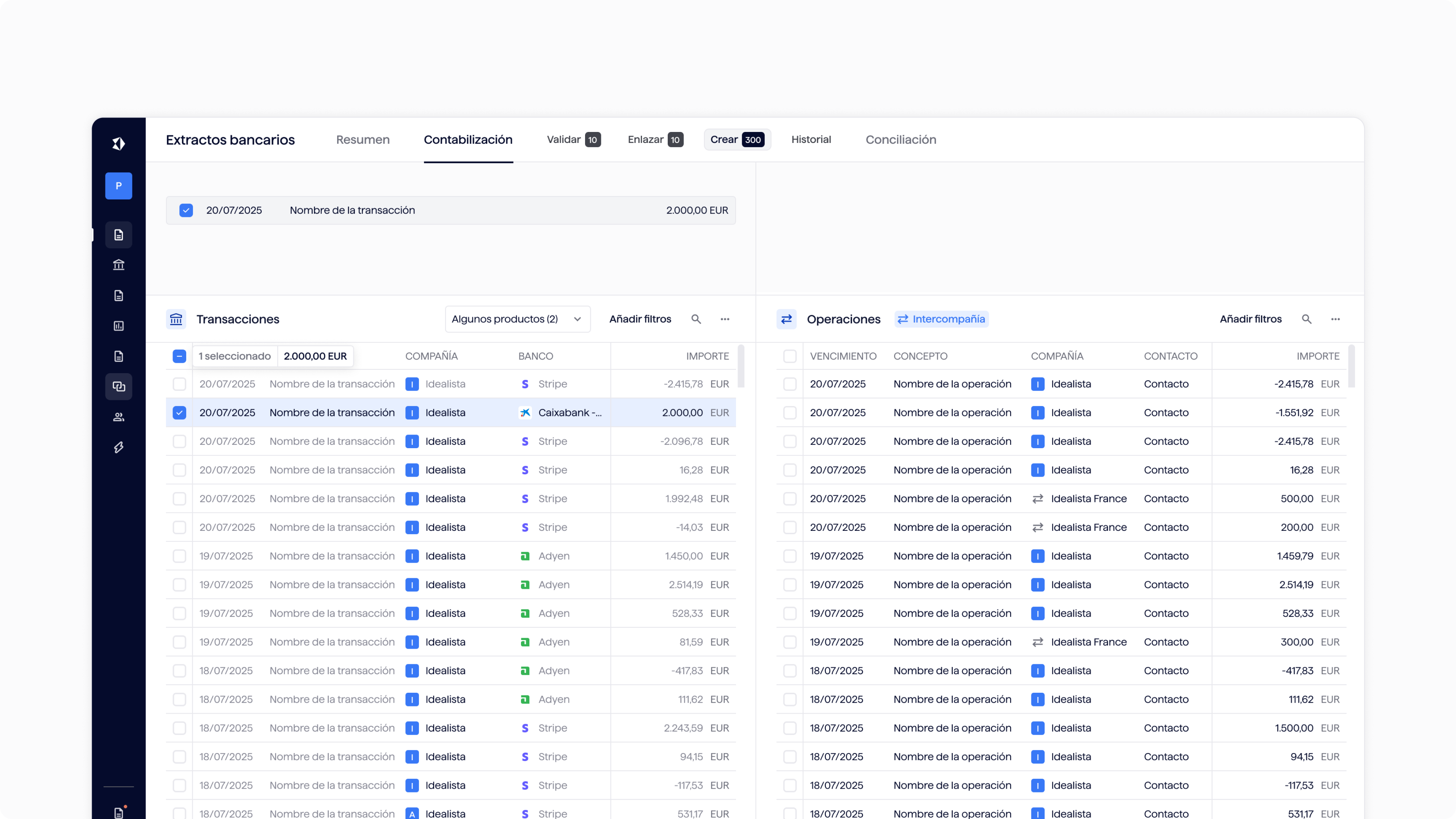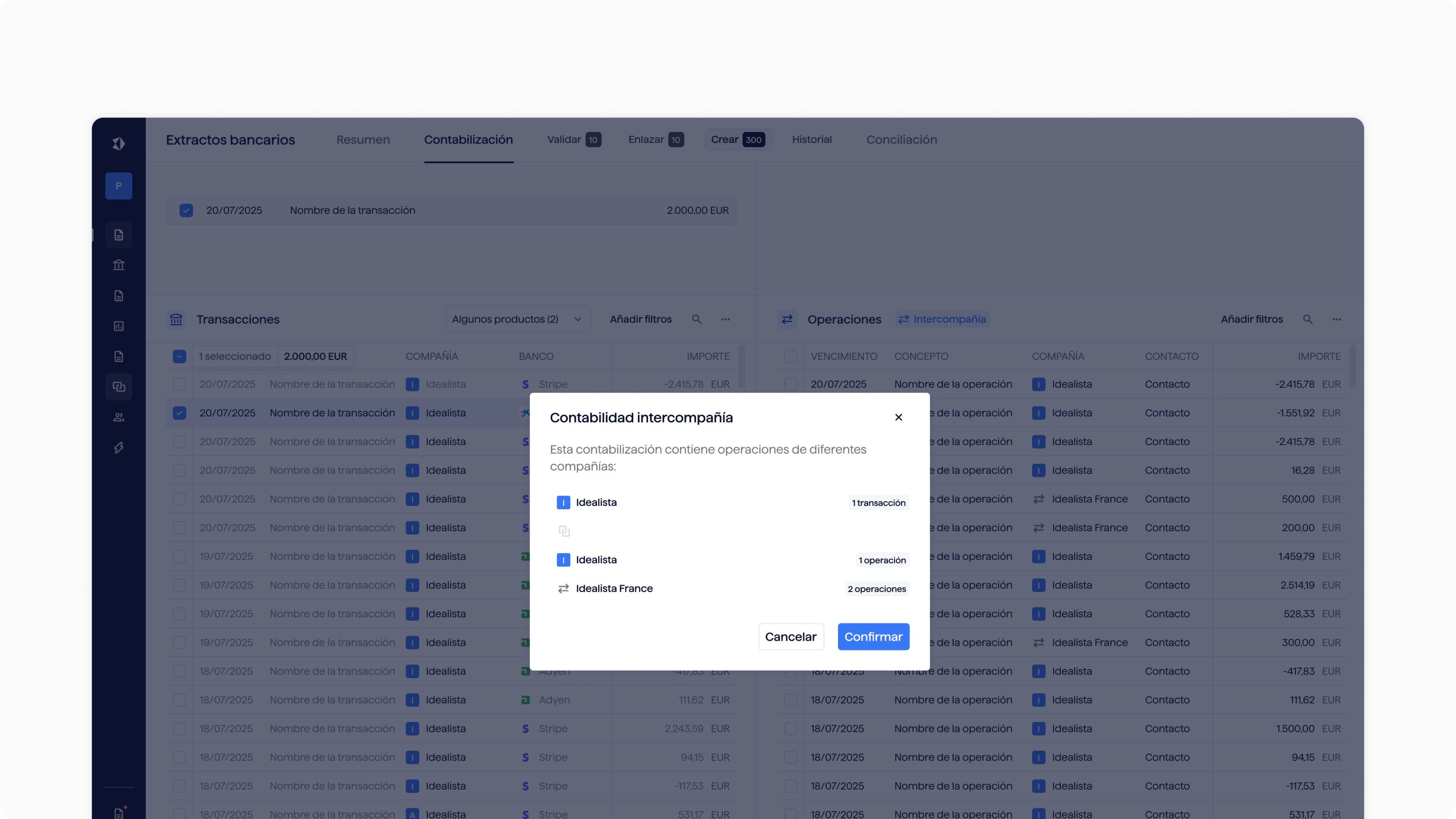 En la tabla de operaciones, verás las facturas pendientes de contabilizar de la entidad seleccionada y de sus empresas relacionadas (por ejemplo, Idealista y Idealista France).