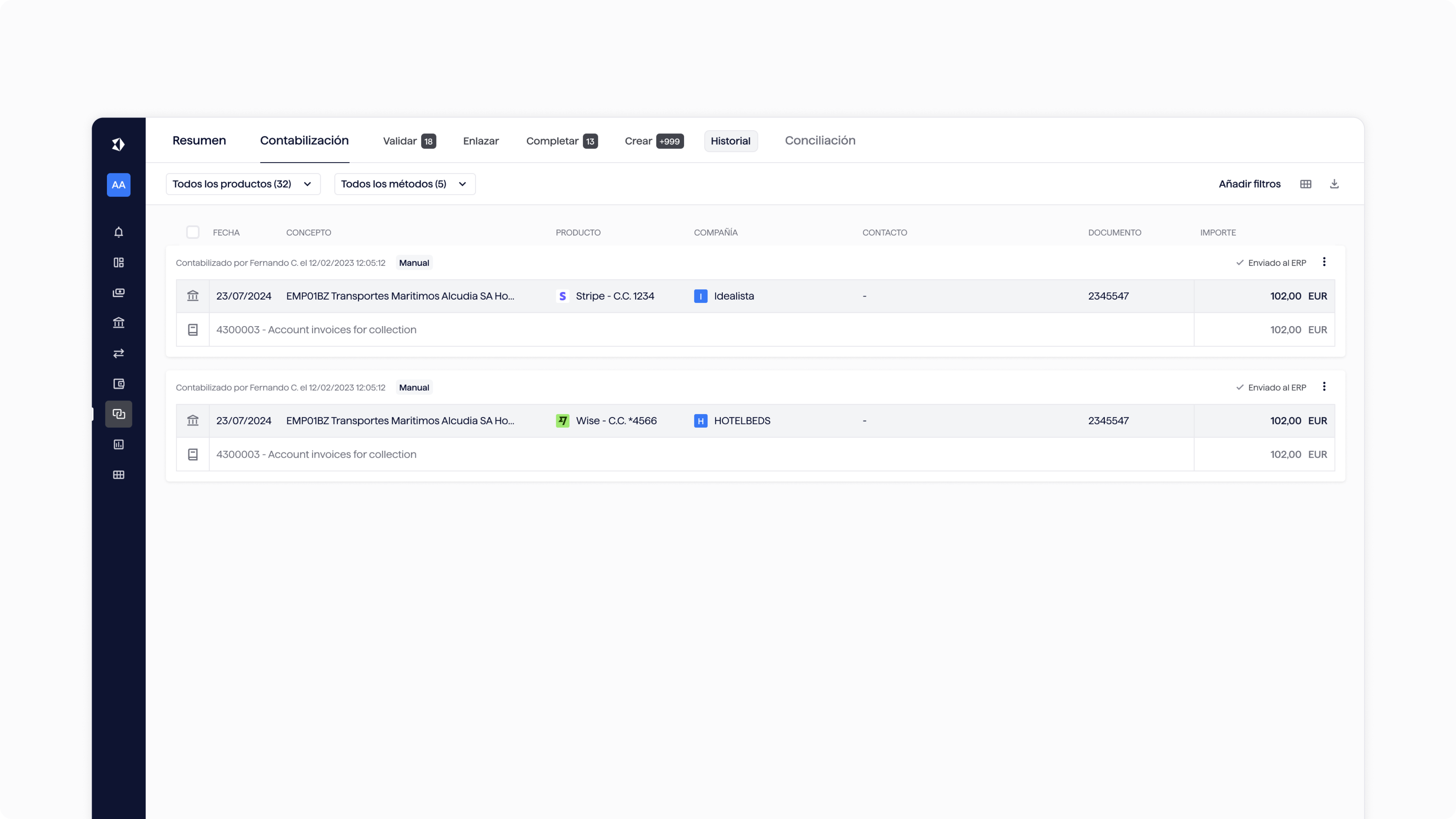 Histórico de asientos: Al consultar las contabilizaciones en el histórico de Contabilidad, encontrarás dos bloques por cada operación: