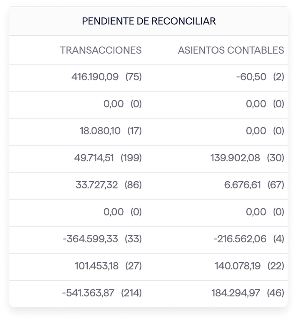 Pendiente de reconciliar: Incluye transacciones aún no contabilizadas o en espera de conciliación, así como asientos contables pendientes de conciliar. El número entre paréntesis hace referencia al número de transacciones o apuntes contables, y la cifra, el importe total. Puedes hacer clic en cada una de las celdas para navegar a la página correspondiente filtrada por ese número de elementos.