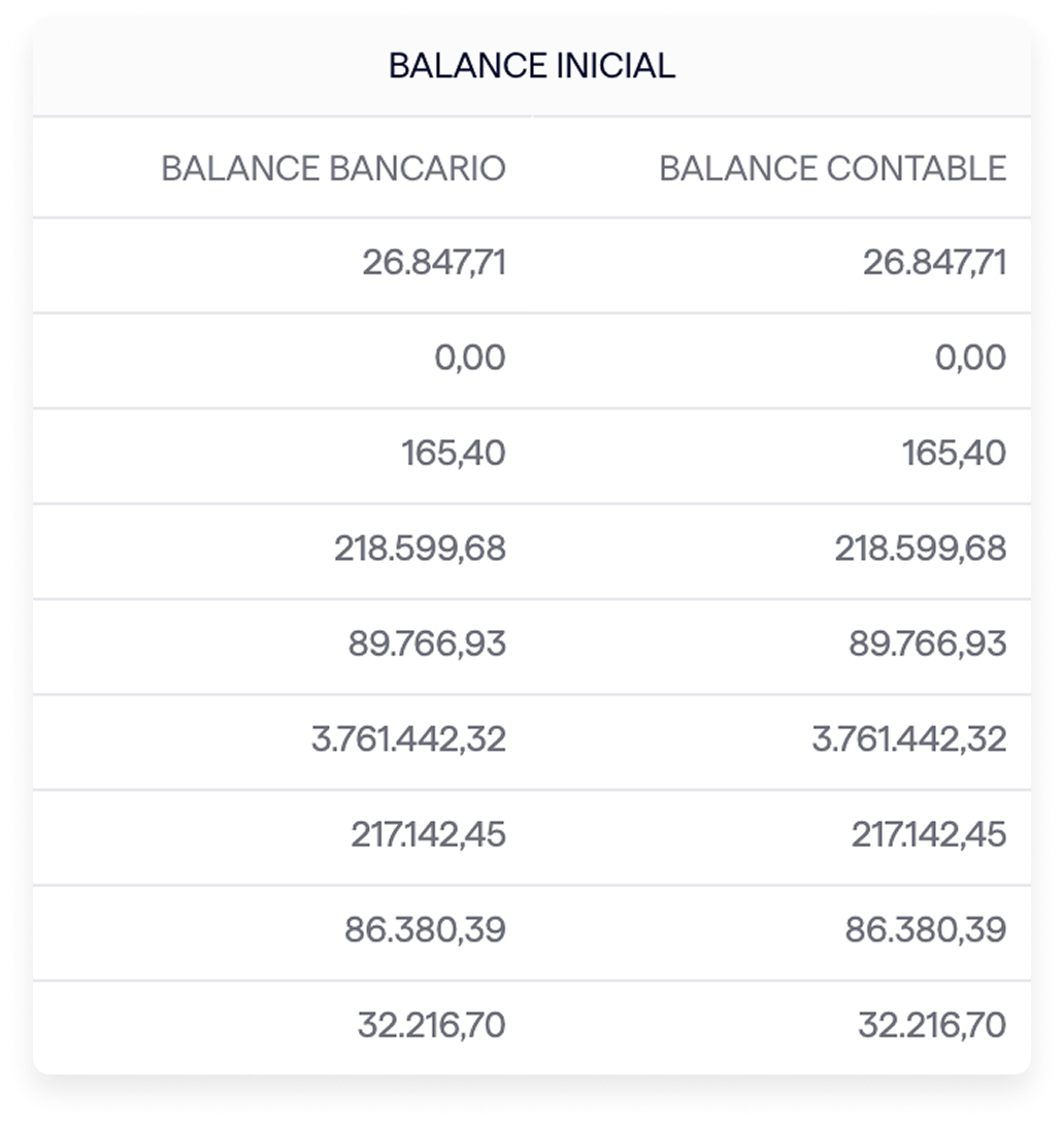 Balance contable: Refleja la suma de asientos contables a inicio del período seleccionado, partiendo del saldo bancario inicial establecido al iniciar el producto en contabilidad.