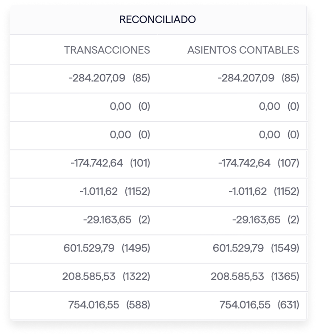 Reconciliado: Transacciones y asientos que ya se encuentran conciliados en el período seleccionado y que por tanto aparecen en el historial de conciliación de Embat. Para transacciones, la fecha de referencia es la fecha operación, y para los asientos, la fecha de creación del asiento.