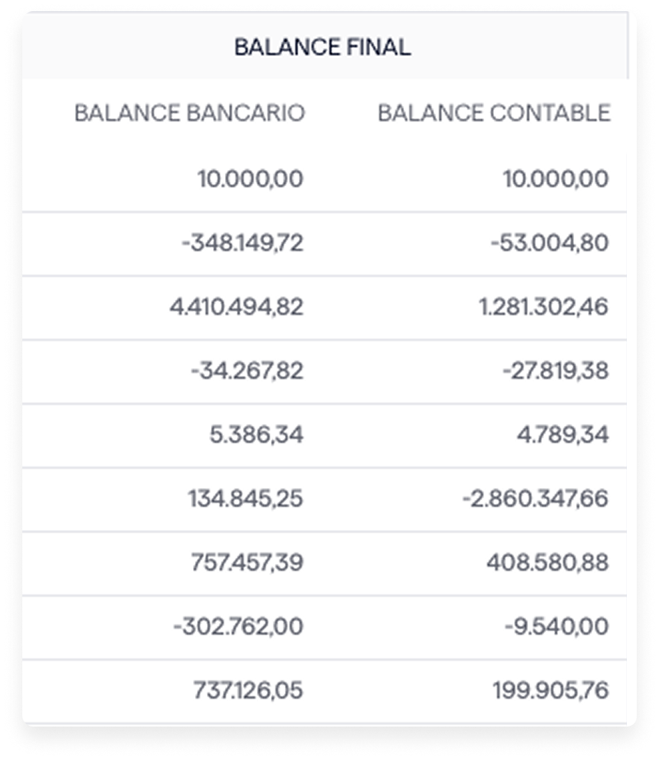 Balance final: Hace referencia al balance bancario y contable a final del periodo seleccionado. Es una métrica clave para detectar si el producto bancario está conciliado o no, ya que, idealmente, balance bancario y contable deberían ser iguales si toda tu conciliación está al día.