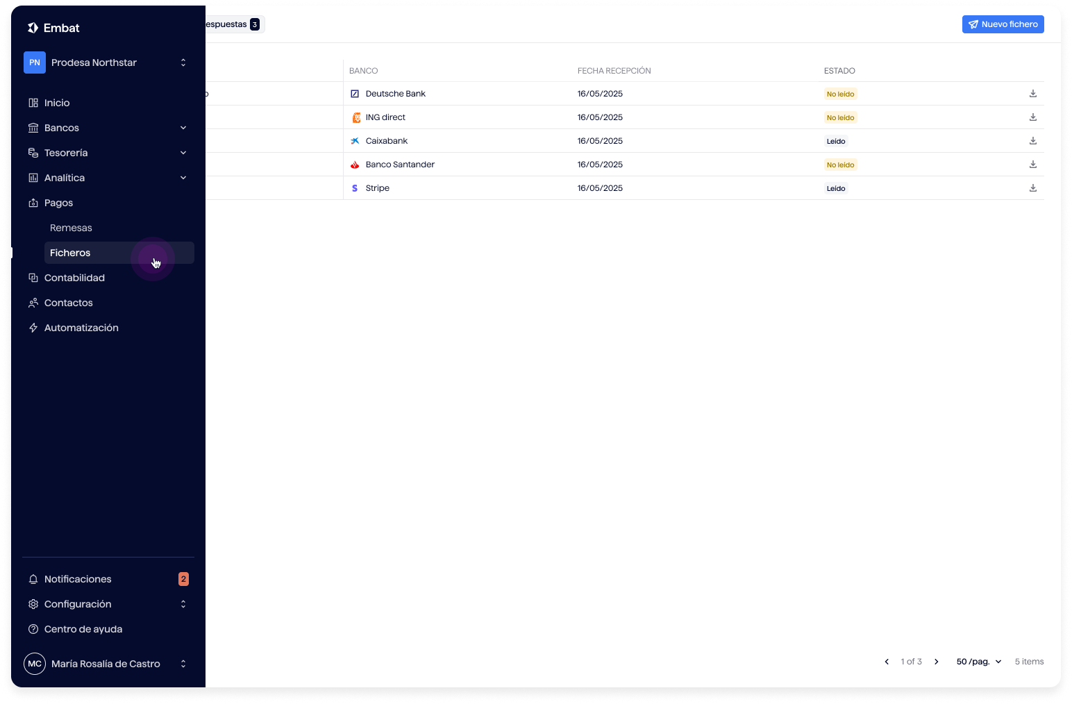 El módulo de Ficheros es un submódulo ligero dentro de Pagos que permite subir y hacer seguimiento de ficheros de pago generados fuera de Embat, normalmente desde tu ERP.