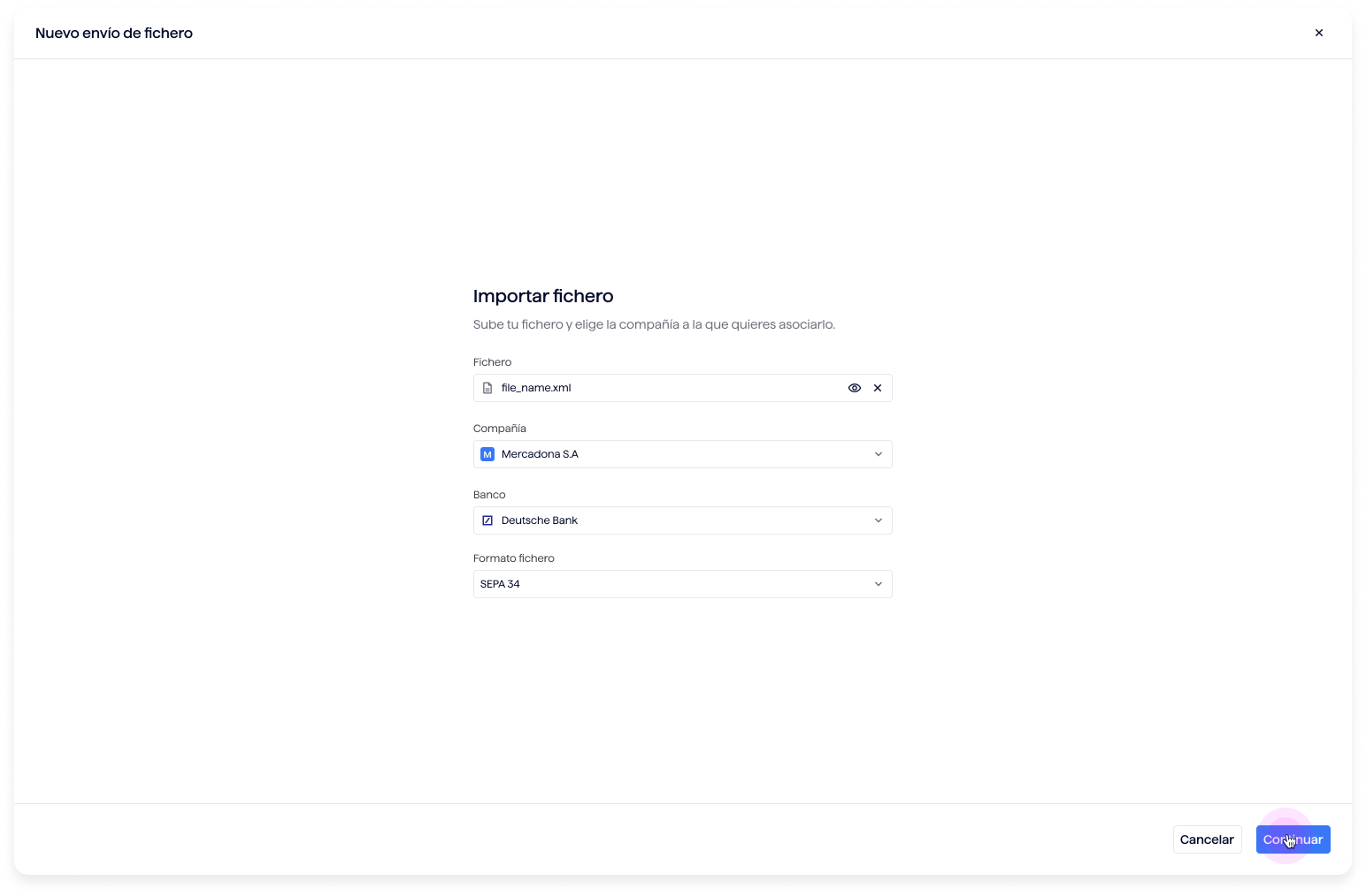 El módulo de Ficheros solo admite ficheros en formato XML. Al subir un fichero, es obligatorio seleccionar el banco de destino y el formato correspondiente.